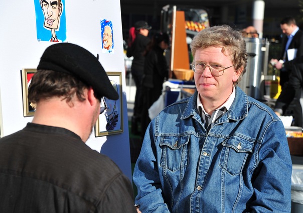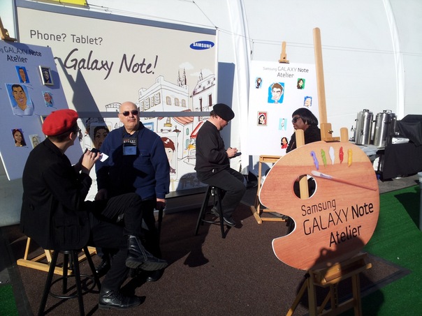У входа на выставку художники рисуют шаржи с помощью смартфона Samsung Galaxy Note (как вы помните, мы тоже используем его для этого репортажа). Этот девайс позволяет рисовать на экране, в том числе поверх сделанных снимков и любых других изображений, даже скриншотов собственного экрана.
