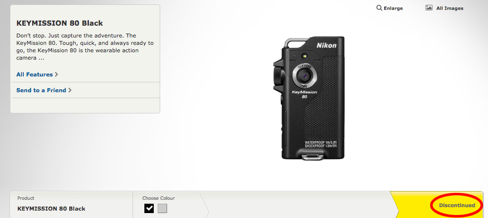 На своем японском и британском веб-сайтах компания Nikon пометила модель экш-камеры KeyMission, как “снятую с производства”. Об этом сообщает ресурс Nikon Rumors. При этом британский сайт пометил, как “снятую с производства” только модель KeyMission 80, про версии KeyMission 170 и 360 такой информации нет. Тогда как на японском сайте компании KeyMission 360 помечена как “старый продукт”, однако KeyMission 80 и 170 не перемещены на страницу камер, чье производство прекращено.
