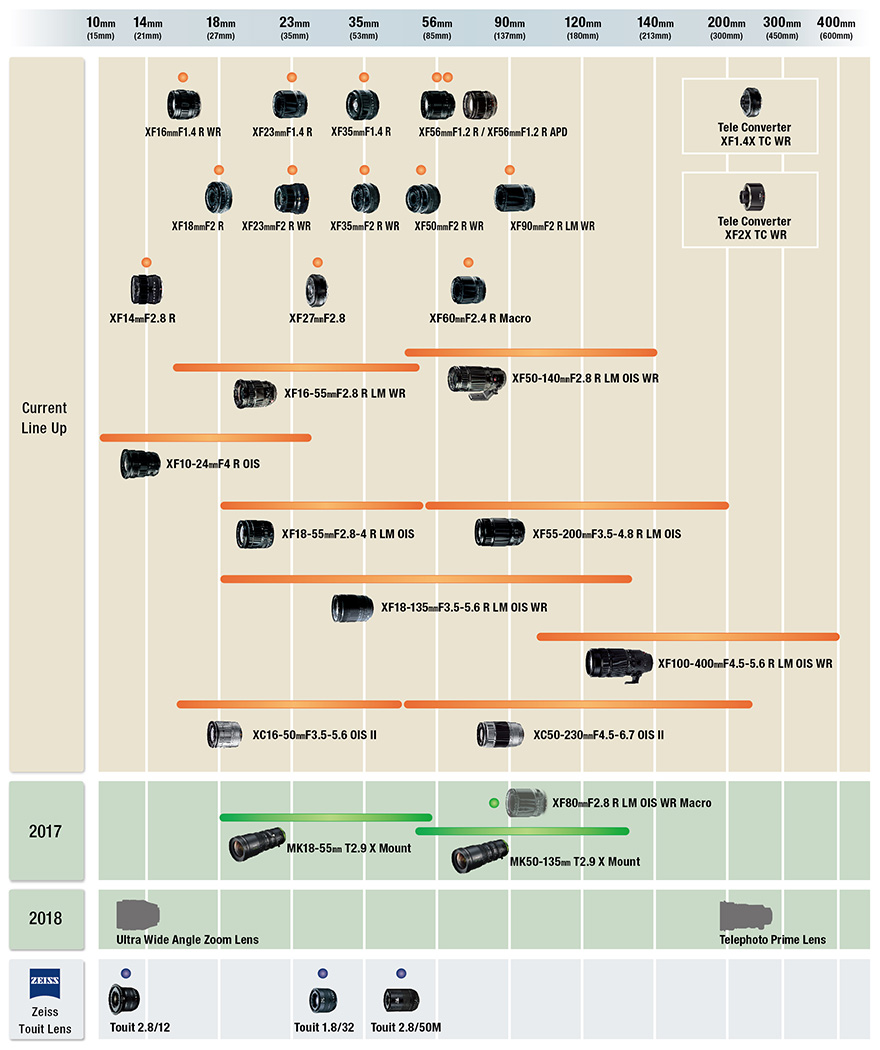 Упор компании Fujifilm на создание кинообъективов и среднеформатных систем не значит, что она забыла о фоттографах, которым необходимы объективы с байонетом X. Компания анонсировала обновленную дорожную карту своих объективов, добавив сверхширокий зум и телефото фикс объектив, которые должны появиться в 2018.
