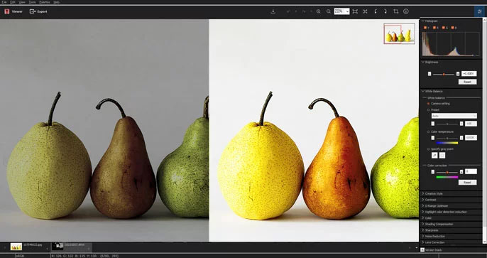 Edit позволяет работать с файлами форматы raw, настраивать яркость и цвета, использовать фильтры Creative Styles, обрезать и вызванивать изображение. Обработанные фото можно экспортировать в форматы JPEG и TIFF.