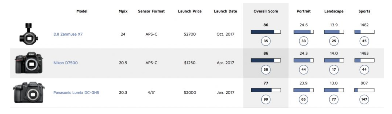 DxOMark: матрица DJI Zenmuse X7 обходит GH5 и занимает место в рейтинге на уровне лучших APS-C камер