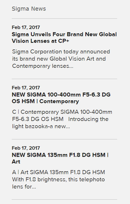 Компания Sigma планирует анонсировать ряд новых объективов на предстоящей выставке Camera & Photo Imaging Show (CP+) 2017, которая будет проходить 23-27 февраля в японском городе Иокогама. Соответствующий заголовок появился на главной странице официального сайта производителя, однако через некоторое время он был убран. Кроме того, появились и пресс-релизы самих объективов. Планируется, что компания объявит фикс телеобъектив 135 мм F/1.8, зум 24-70 мм F/2.8, а такжеширокоугольник 14мм F/1.8. Также в заголовоке пресс-релиза упоминается модель 100-400mm F5-6.3 DG OS HSM | Contemporary. Полную информацию о характеристиках, цене и дате старта продаж объективов мы узнаем на мероприятии.