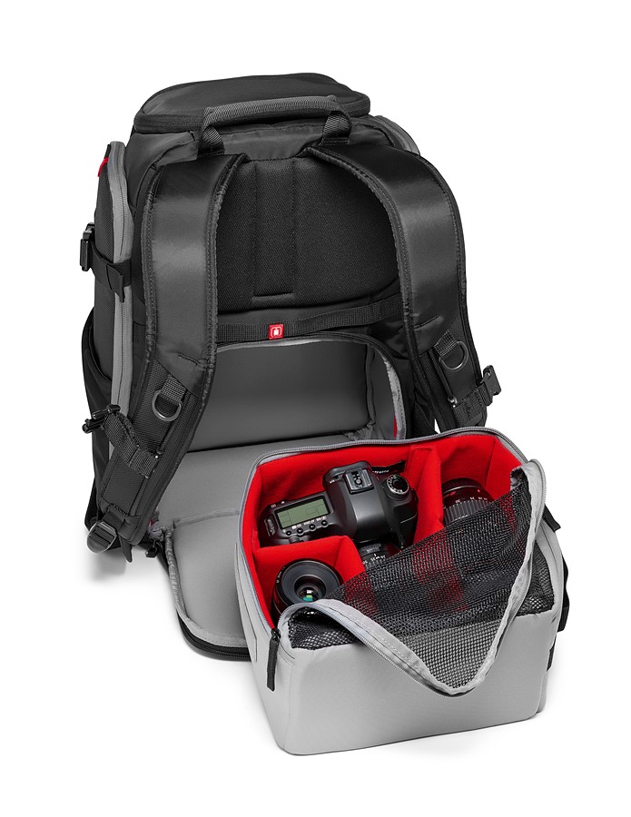 Новинка получила название Advanced Rear Backpack, которое кратко и емко описывает эту особенность. Дело в том, что многие фотографы уже имели печальный опыт поездки с рюкзаком, набитым дорогостоющей техникой, например, в общественном транспорте - ведь вокруг всегда есть масса желающих, которые хотели бы получить такой набор безвозмездно. Компания Manfrotto решила вопрос просто - загрузка в рюкзак Advanced Rear Backpack осуществляется со стороны ремней, а значит попытки что-нибудь стащить из рюкзака не останутся незамеченными. Отделение под фототехнику располагается между самих ремней, в нижней части рюкзака. Оно закрывается на молнию, а внутри имеет специальный каркас, который позволит разместить внутри достаточно большую зеркалку, до 3 объективов с разными ФР, вспышку и еще несколько мелких аксессуаров. Каркас при этом сделали съемным - его можно легко вынуть и использовать рюкзак для любой другой цели.