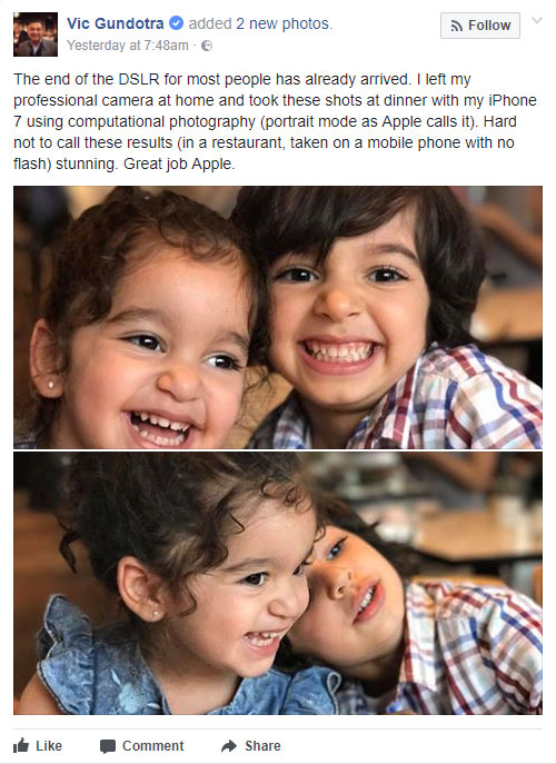 В своем посте в Facebook, Гандорта назвал портретный режим iPhone 7 Plus “великолепным”, а также сообщил, что девайс делает бессмысленным цифровые зеркалки для большинства пользователей. Отвечая на комментарии к посту, Гандорта заявил, что в том, что касается камеры iPhone на годы опередил Android.