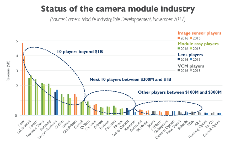 На суб-рынках матриц и наборов объективов время квазимонополии Sony и Largan постепенно приходит к концу, поскольку конкуренты быстро догоняют их в том, что касается технологий. Производители модулей, такие как лидеры рынка LG Innotek, сильно зависят от лояльности клиентов, поскольку потеря крупного клиента может потенциально привести к краху компании.