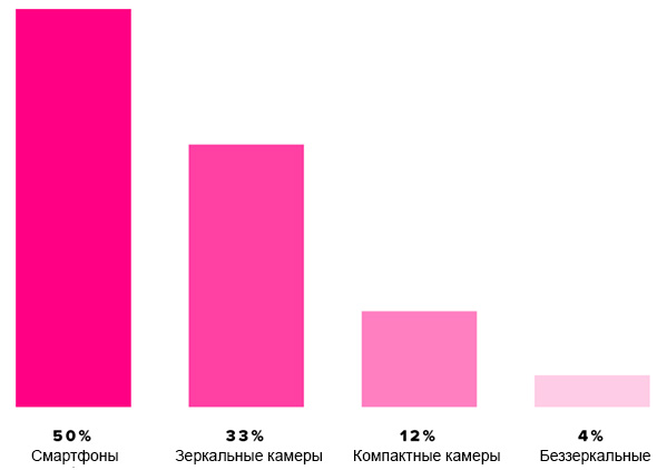 С другой стороны, цифровые зеркальные камеры были использованы для 33% из загруженных снимков, в 2016 эта цифра составляла лишь 25%. И совершенно неудивительно, что доля снимков на простые компактные камеры (“мыльницы”) упала с 21% в 2016 до 12% в этом году.