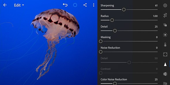 Пользователи Android/ChromeOS получили новую панель Details (детализация), которая включает слайдеры Sharpening (резкость) и Noise Reduction (уменьшение шума), опцию Grain (зерно), а также дополнительные настройки для обмена изображениями через Lightroom CC Web.