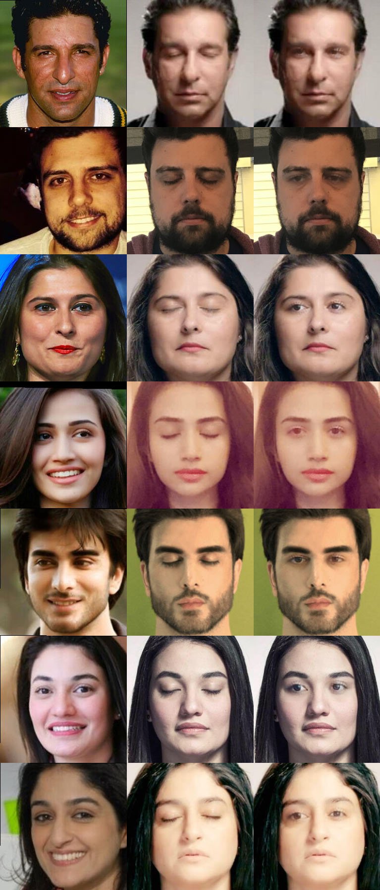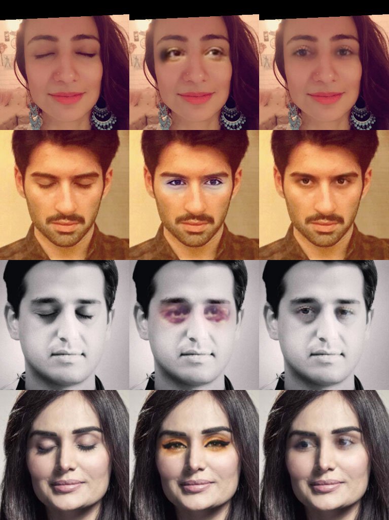 Референсные фото (слева), фото с закрытыми глазами (центр), фото с “созданными” ИИ глазами (справа)