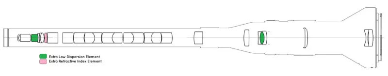 Оптическая схема новинки состоит из 27 элементов (в том числе один экстра-рефракционный элемент и один элемент со сверхнизкой дисперсией) в 19 группах. Диафрагма новинки имеет 7 лепестков.