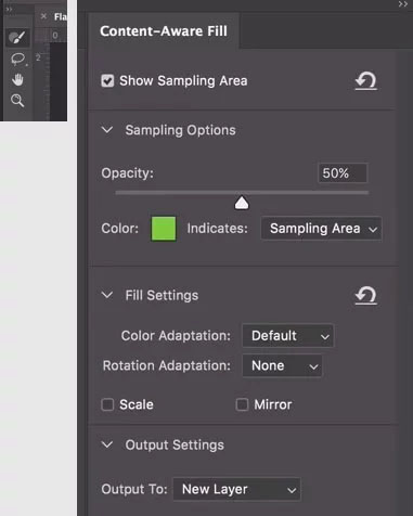 Сейчас функция Content-Aware Fill представлена простым окном с самой базовой системой настроек: