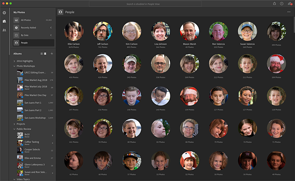 В новом Lightroom CC появилась библиотека People View, которая автоматически идентифицирует людей на фотографиях и собирает их в единую подборку. Библиотека индексируется и анализируется через дата-центры Adobe, что обеспечивает серьезное ускорение работы инструмента распознавания лиц. Для поиска и распознавания используется вышеназванный алгоритм Adobe Sensei. Вкладка People View находится в категории My Photos.