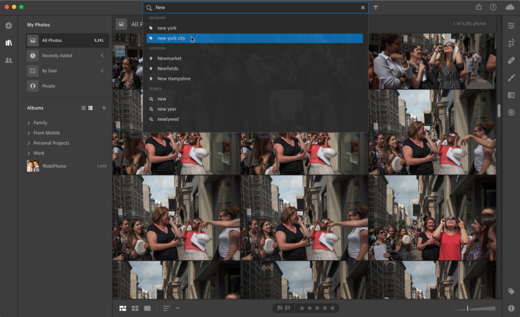 Кроме того, поиск стал полностью онлайновым, т.е. при отключенном интернете поиск просто не будет работать (только фильтры). Также при включенном интернете, но приостановленной функции синхронизации, поиск не будет отображать фотографии, которые не были добавлены в Creative Cloud.