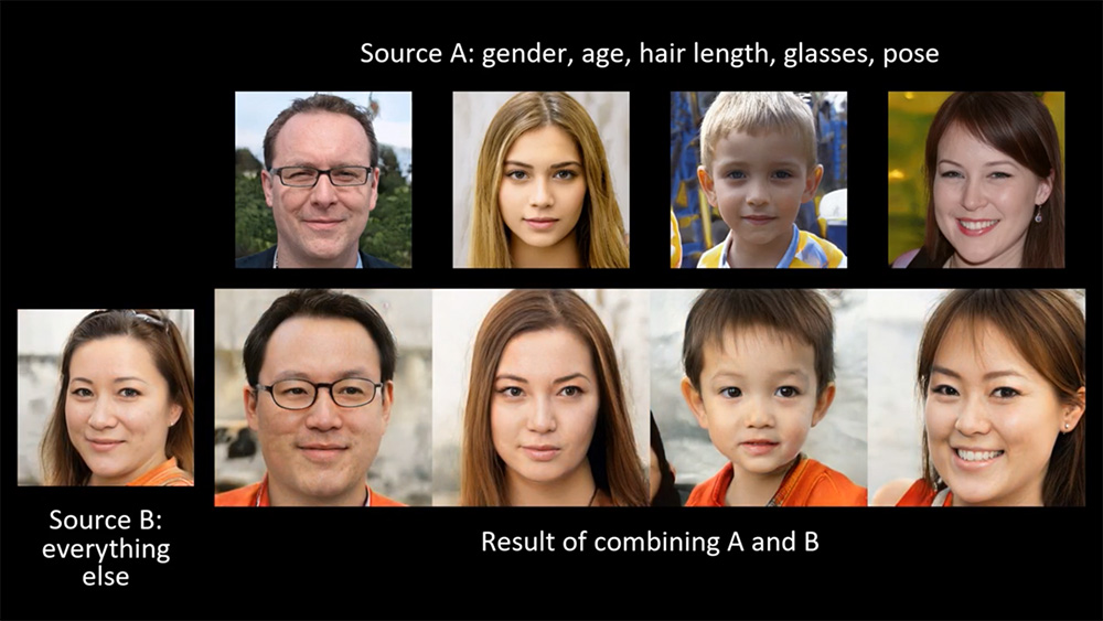Команда исследователей применила новую архитектуру генеративно-состязательной сети (GAN), основанную на стилях, которая позволяет GAN-сетям генерировать новые лица, основываясь на фотографиях настоящих людей. Генератор самостоятельно учится различать отдельные элементы в изображениях и переносит их на другие портреты. В видео ниже показано, как сохранив ряд характеристик первого портрета (пол, возраст, длина волос, поза), алгоритм применил к нему все остальные признаки со второго портрета, что позволило получить совершенно нового человека. При этом можно применять характеристики сразу к целым сериям фотографий различных людей.