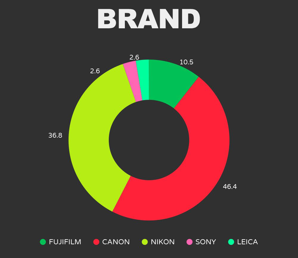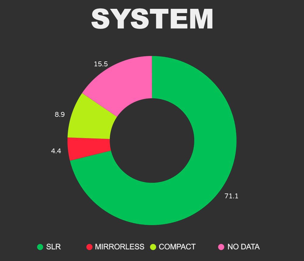 Цифровые зеркалки по-прежнему доминируют в фотожурналистике: 71,1% лучших фотографий снятj на них, тогда как беззеркальные системы использовались только в 4,4% случаев.