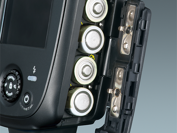 При использовании с литий-ионными батареями Type 14500 перезарядка вспышки занимает 1,5 секунды, а при использовании четырех АА батарей это время возрастает до 3,8 секунд. При использовании четырех литий-ионных батарей емкостью 650 мАч можно сделать до 280 вспышек, а при использовании четырех перезаряжаемых батарей емкостью 2350 мАч – 320 вспышек.