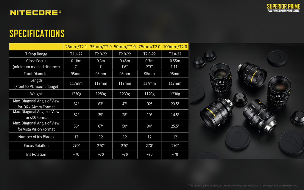 Серия состоит из пяти объективов: 25mm T2.1, 35mm T2.0, 50mm T2.0, 75mm T2.0 и 100mm T2.0. Все объективы 117мм в длину (вместе с байонетом PL) и 95мм в диаметре, что позволяет быстро менять их во время съемки. Nitecore сообщает, что они будут доступны со сменными байонетами PL, Canon EF и Sony E, однако изначально будут поставляться с байонетом PL.