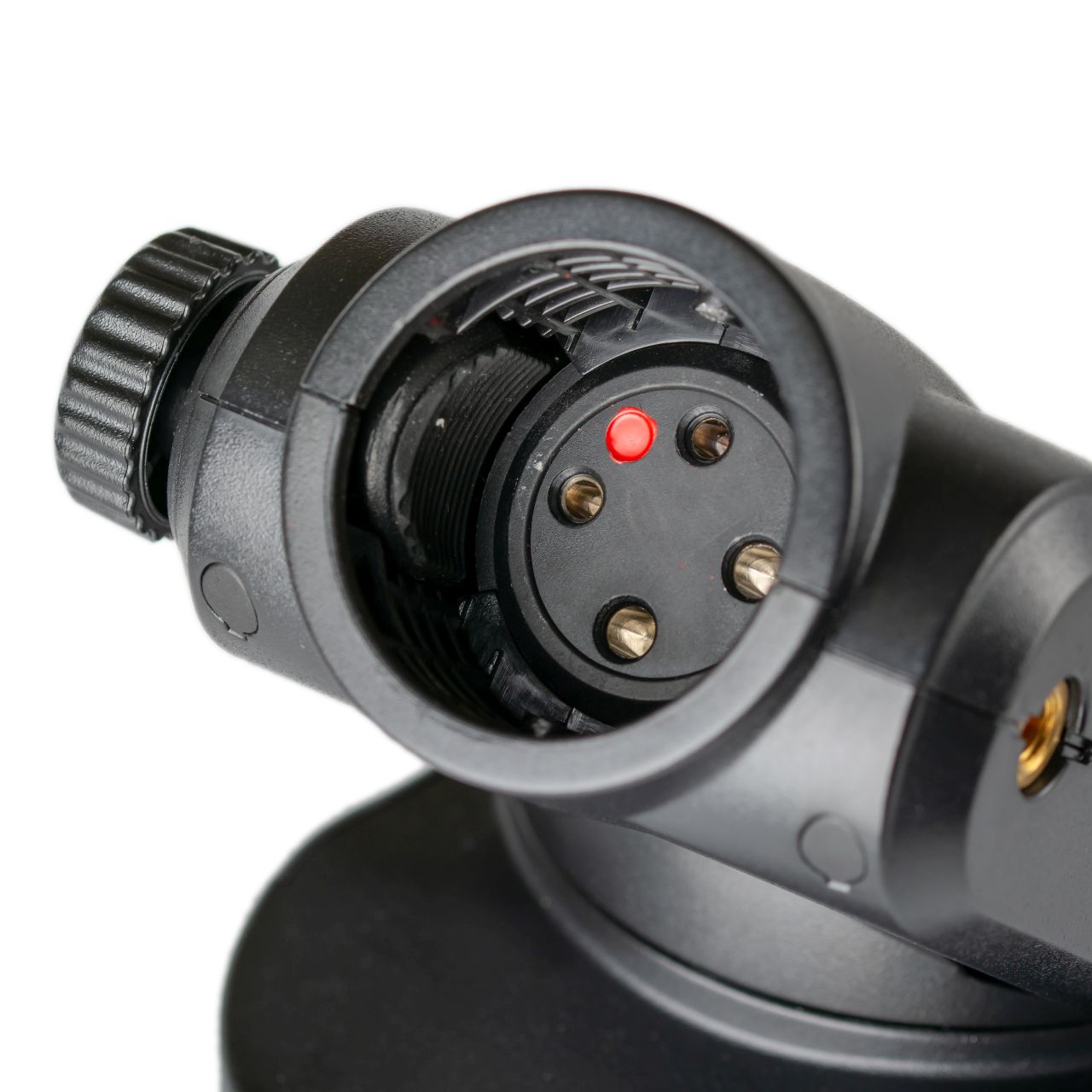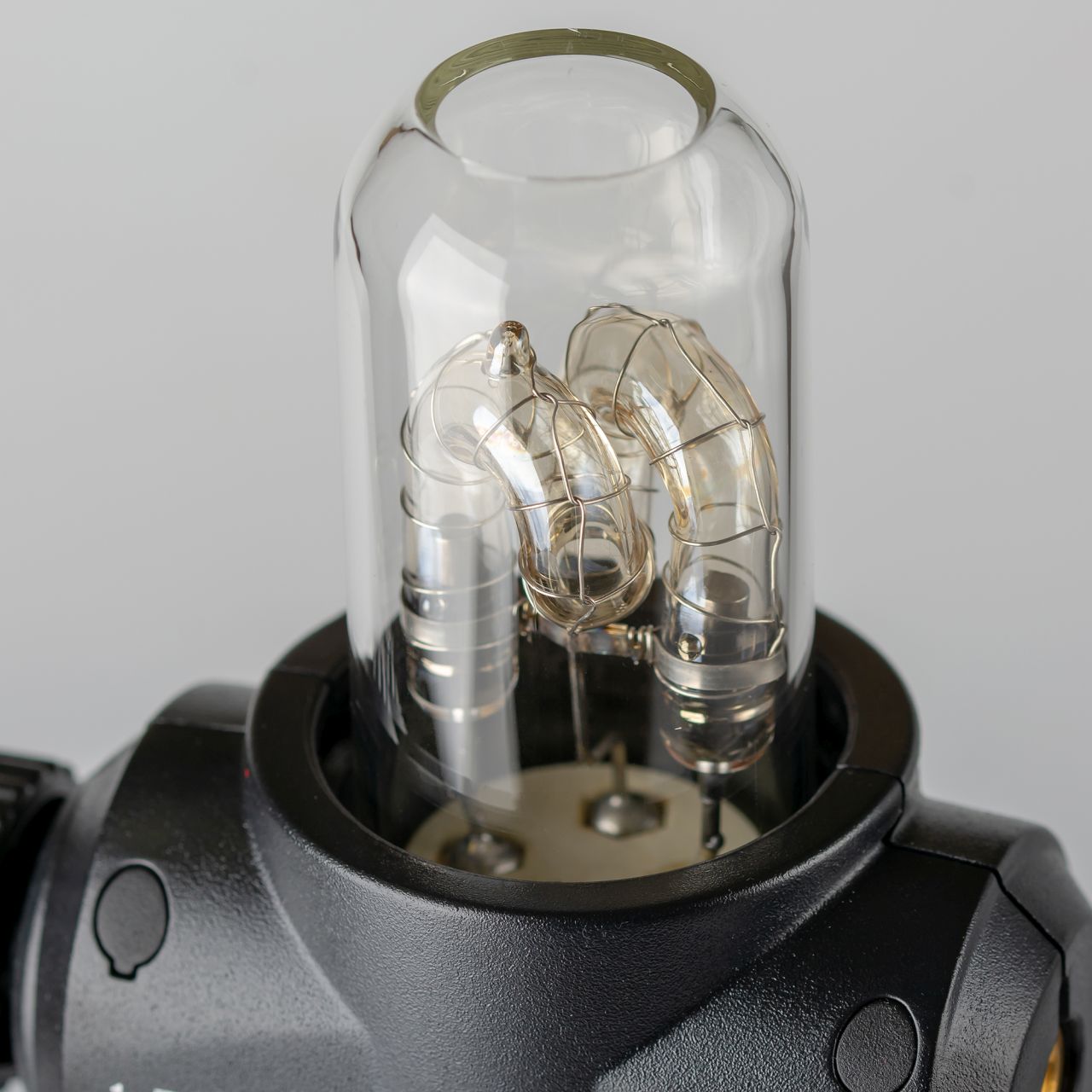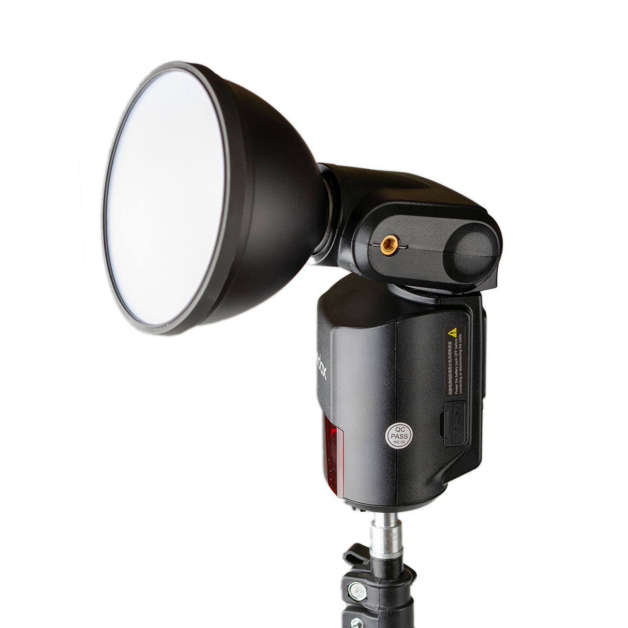 Импульсная лампа сменная, для ее правильного позиционирования в гнезде есть специальная метка. Также на поворотном блоке есть резьбовое отверстие ¼”, таким образом вспышку можно разместить на стойке или штативе, закрепив в этом отверстии, но оно тут не только для этого. Там же можно закрепить специальный адаптер для установки зонта на вспышку - отличное решение, таким образом, импульсная лампа располагается максимально близко к центру зонта. К сожалению, у AD360II нет возможности подключения головы с контролируемым углом рассеивания, аналогично вспышке Godox Witstro AD200.